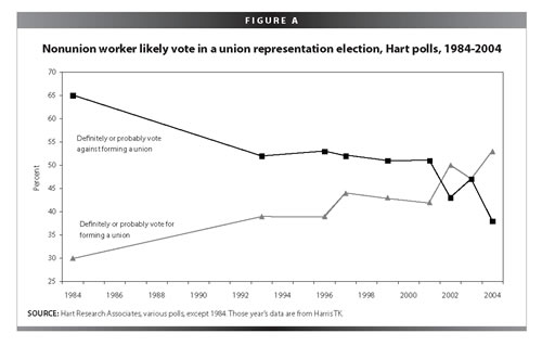 9. But not all recent surveys, however, show such high proportions wanting to unionize as does the Hart survey. A 2005 Zogby poll reports that 36% of nonunion workers were likely to vote union, which is 4 points (13%) above the 32% WRPS estimate for 1994-95 but far below the 53% Hart estimate for that year. Zogby International, The Attitudes and Opinions of Unionized and Non-Unionized Workers Employed in Various Sectors of the Economy Toward Organized Labor, report to the Public Service Research Foundation, August 2005. It is unclear why the 2005 Zogby estimate is so much lower than Hart’s, or Zogby’s own estimate the previous year. Then, on a slightly different question wording – “If you had a choice, how likely would you be to join a union?” – Zogy found that 45% of nonunion workers would likely join one. See Zogby International, Nationwide Attitudes Toward Unions, report to the Public Service Research Foundation, February 2004.