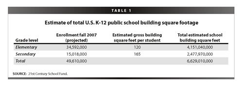 In addition to building space, schools also utilize extensive land and site amenities such as roads, parking, lighting, sidewalks, storm water management systems, athletic fields, recreational areas, and green space. Using a similar approach to estimate the total land area utilized by public schools yields a conservative estimate of over 1 million acres (Table 2).3